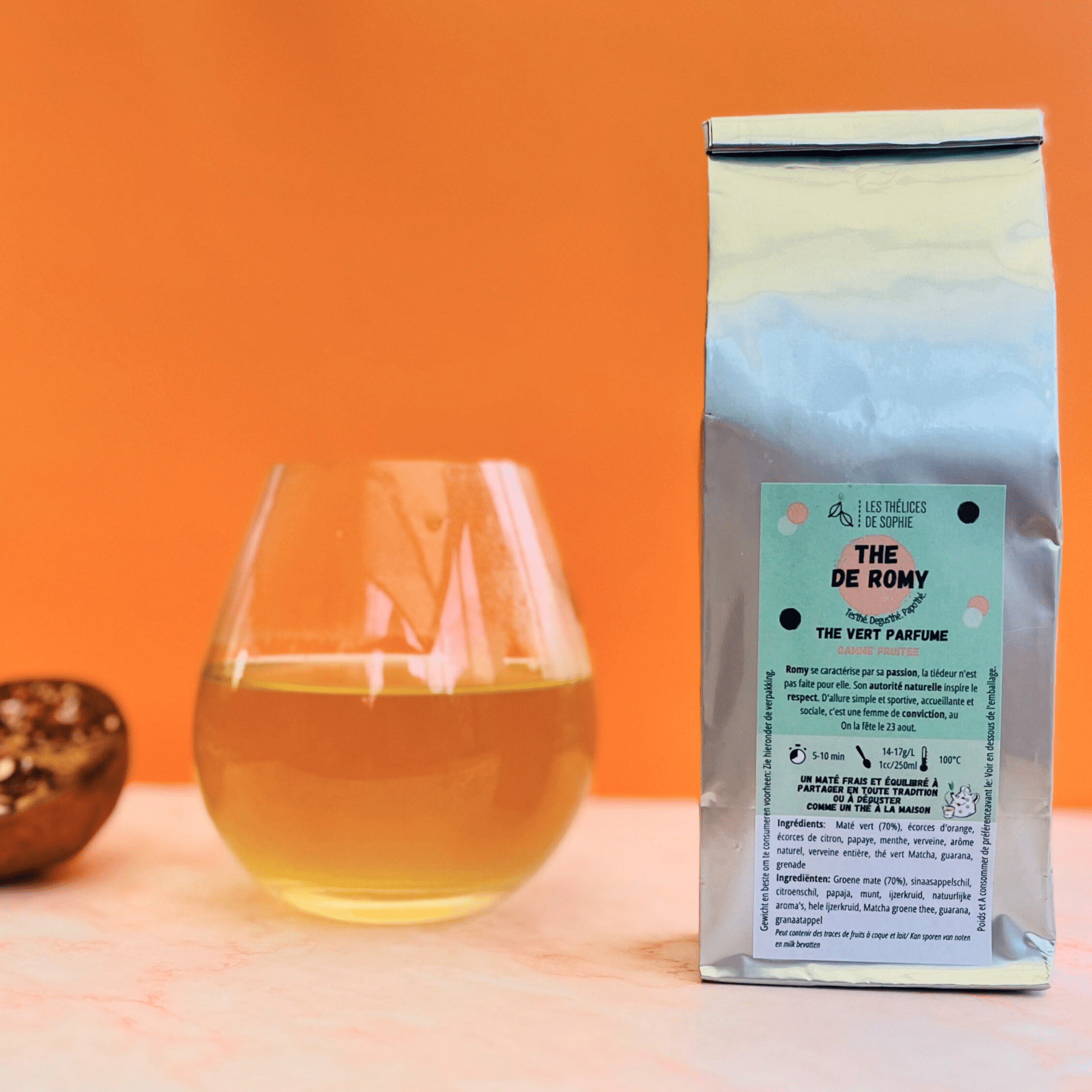 Dites Bonjour au thé de Romy, un mélange vif et chaleureux mêlant maté, agrumes, plantes et grenade. Une chaleur fruitée qui rassemble et illumine chaque gorgée (Ingrédients)